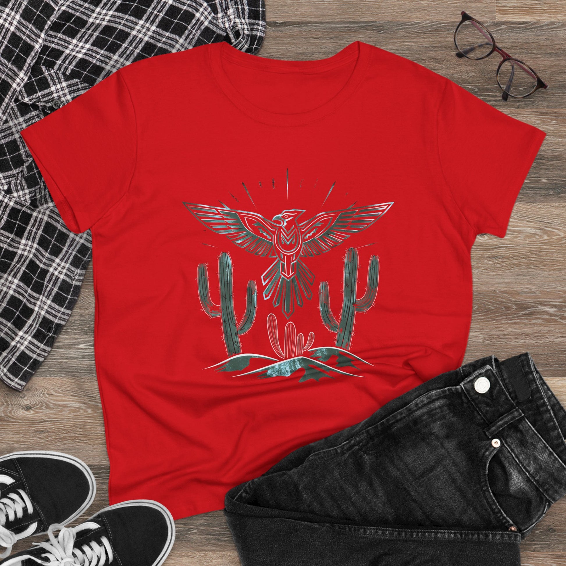 Embrace western fashion with this cowgirl themed tee featuring a thunderbird design. Perfect for those who love retro western style and want to make a statement with their outfit. Ideal for casual wear, concerts, rodeos, and country-themed events.